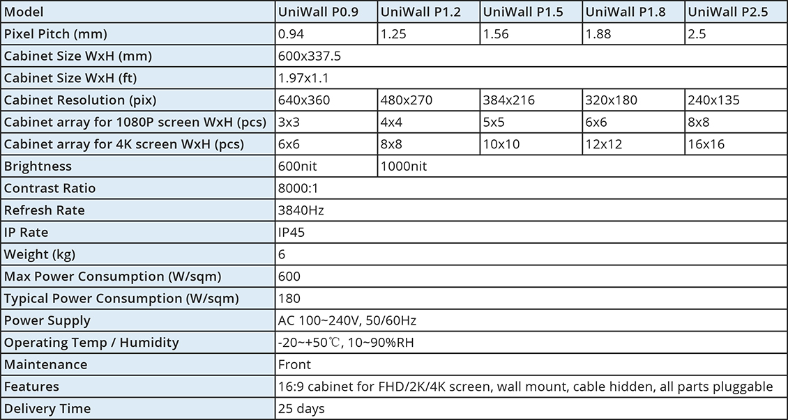UniWall P0.9, Ultra thin, 600x337.5mm cabinet, 640x360pix, 600nit, 3840Hz, IP65, 6kg, Wall mount/hoisting, 8000:1 contrast best color quality, Cable hidden design, All parts pluggable quick service